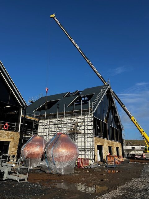 Phase 3: Precision Installation The installation was executed in carefully choreographed phases. Our experienced crews positioned the main copper pot stills on their elevated platforms, achieving precise alignment critical for distillation performance. Each lift operation was supervised by qualified personnel using proven techniques to protect the hand-crafted copper surfaces. The condensers were then integrated to create a complete distillation system, with all connections verified against Forsyths’ specifications.