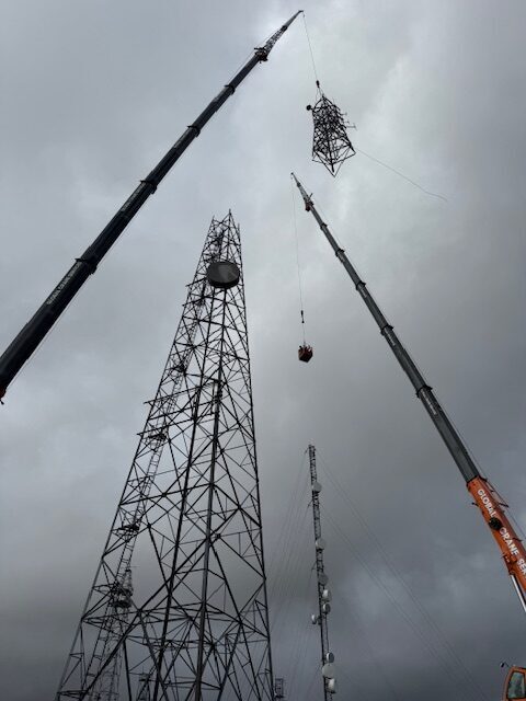 - Coordinated positioning of both cranes’ booms reaching the upper sections of the 30-year-old lattice tower.